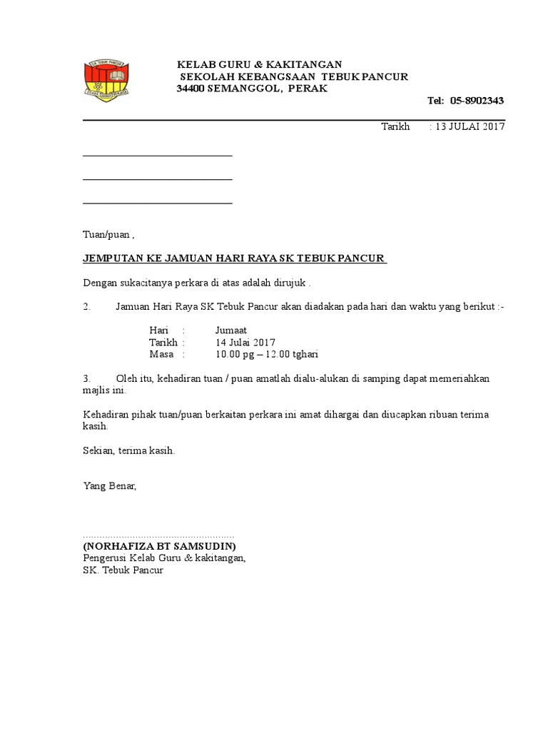 Contoh Surat Jemputan Jamuan Hari Raya Contoh Surat. Tarikh Hari Masa Tempat. Jun 26 2019 contoh surat jemputan ke majlis hari raya.